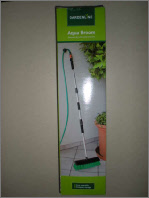 A garden broom that attaches to a hosepipe so that you can brush and wash your patio